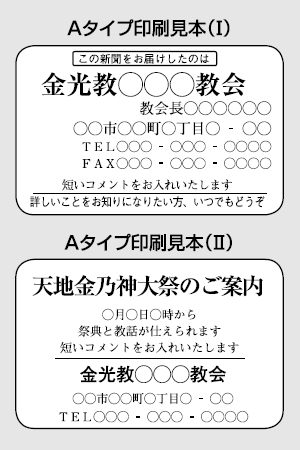 右の見本どおりでよろしければ、金光教徒社で原稿を作成します。短いコメントを入れる場合は、金光教報「天地」巻末のお申し込みはがきの通信欄にお書きください。ご希望の書体やマークがあれば、原寸大の印刷原稿を作成してお送りください。