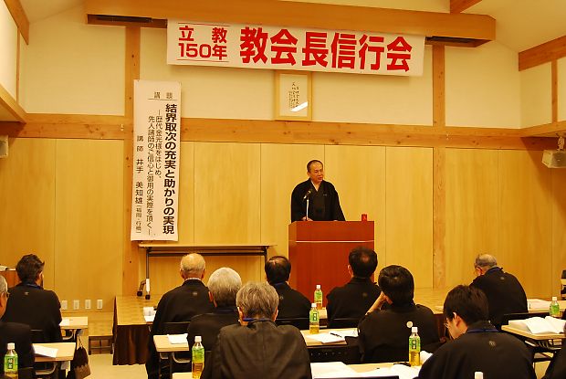 2009年5月26日から、教会長信行会が始まりました。教会長信行会は、立教150年のお年柄にあたり、全教の教会長が本部に集まり、さらなる結界取次の充実と助かりの実現に向けて、歴代金光様、先人諸師のご信心と御用の実際を頂くことを願って開催するものです。